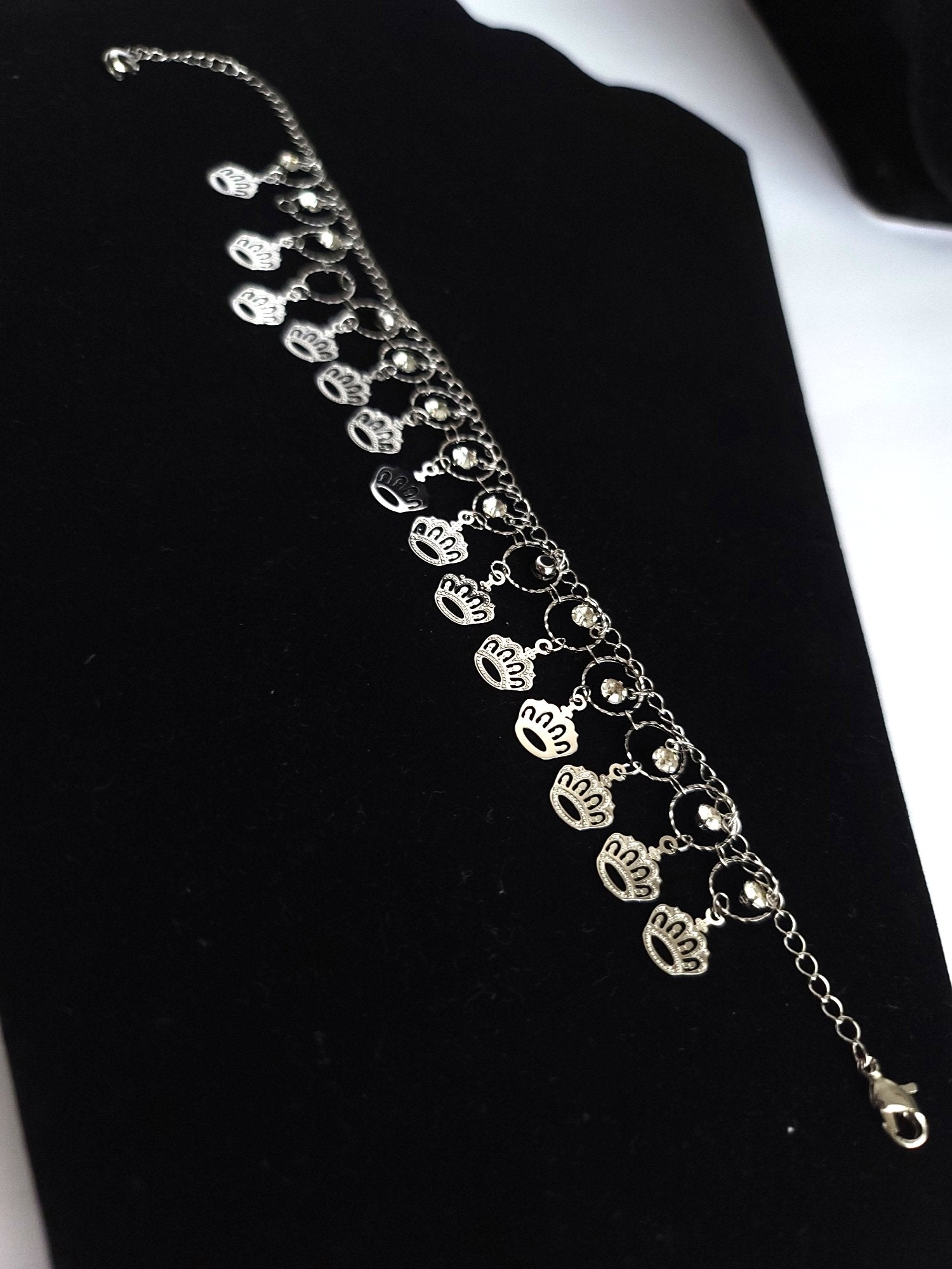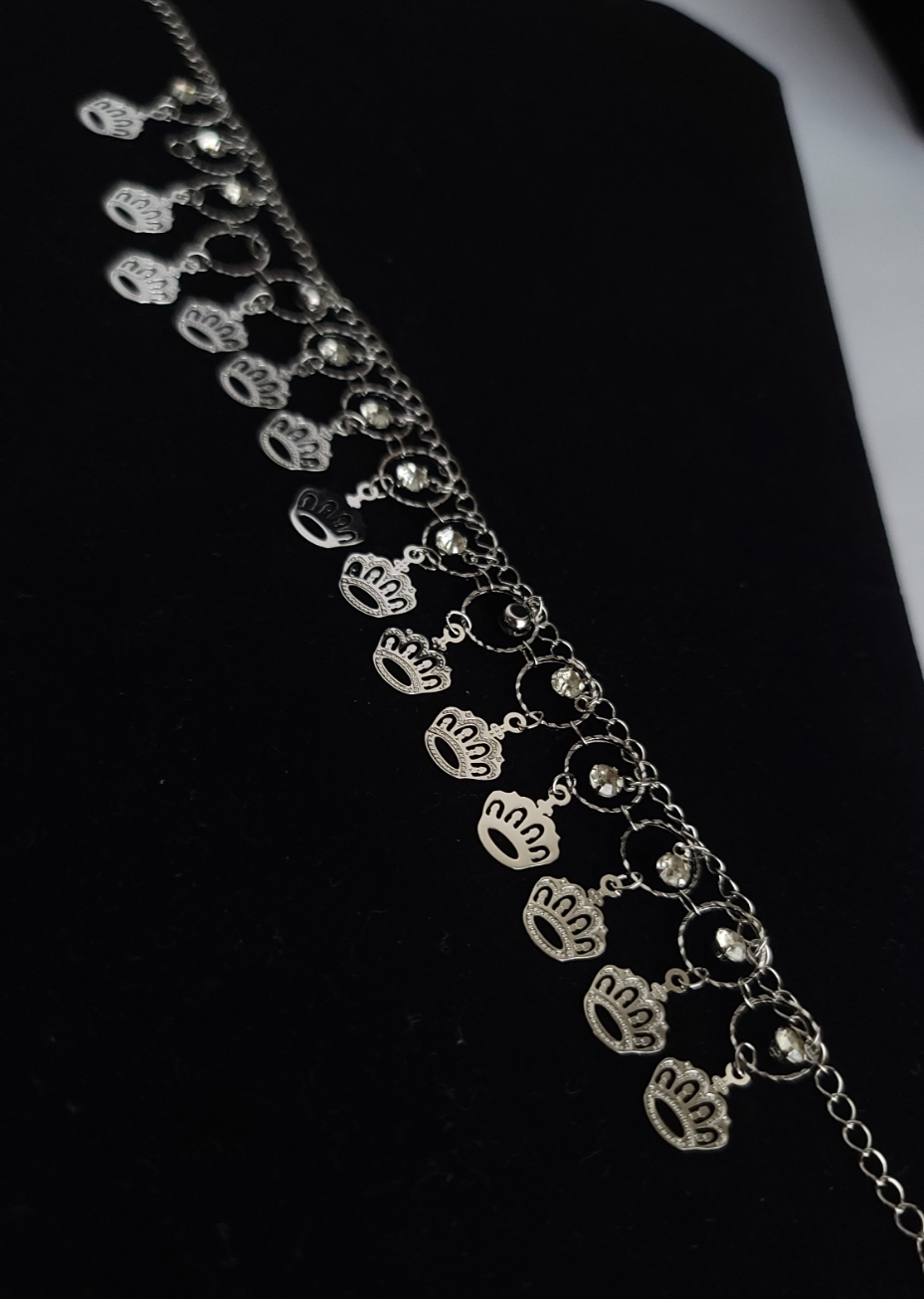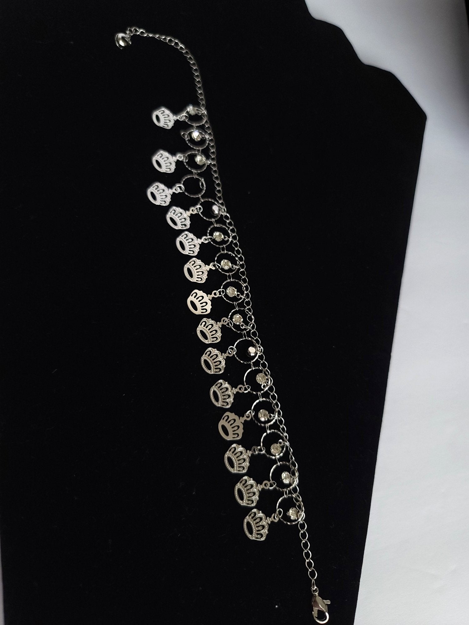Available in silver the ankle is 9-10 inches long. The ankle has crown shape charms and rhinestone with a bell on the end. Light in weight.