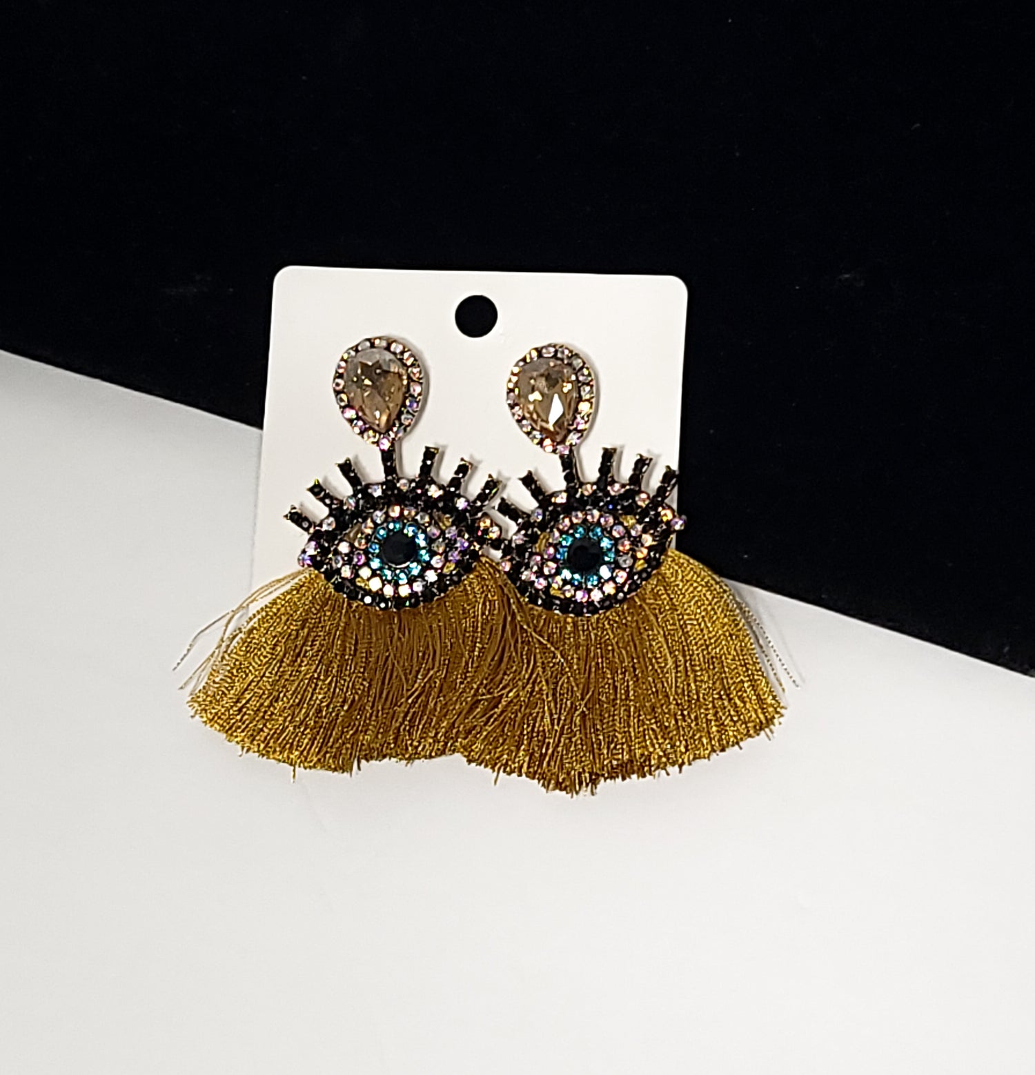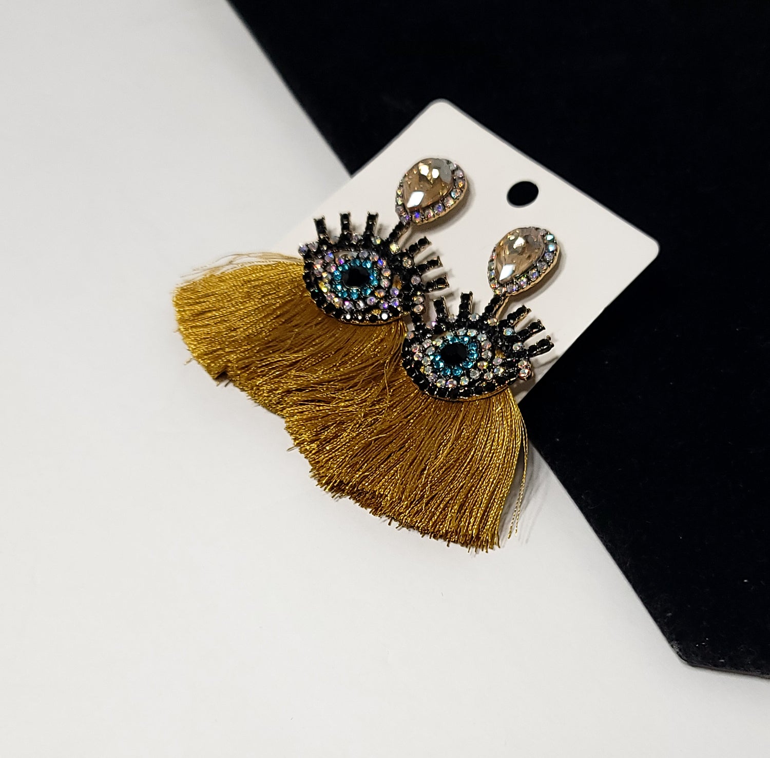 Evil eye earrings encrusted with glass rhinestones with fabric fringe on the ends.