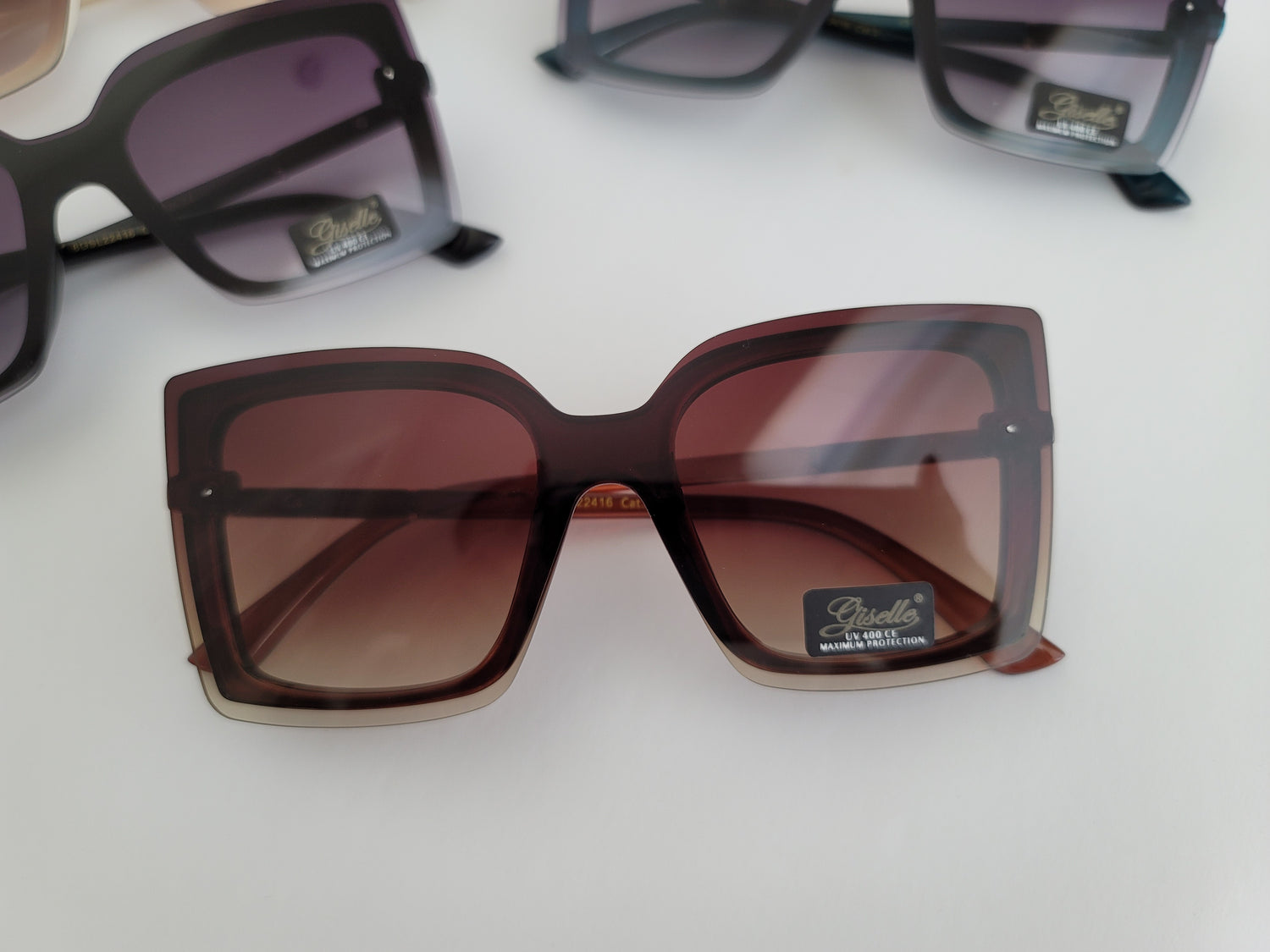 Rim less with UV 400 CE Maximum Protection with two tone color lenses. This arms of the glasses are available in cream, translucent brown, translucent blue and black. This was an assorted pack so there's more black armed glasses than any other color.
