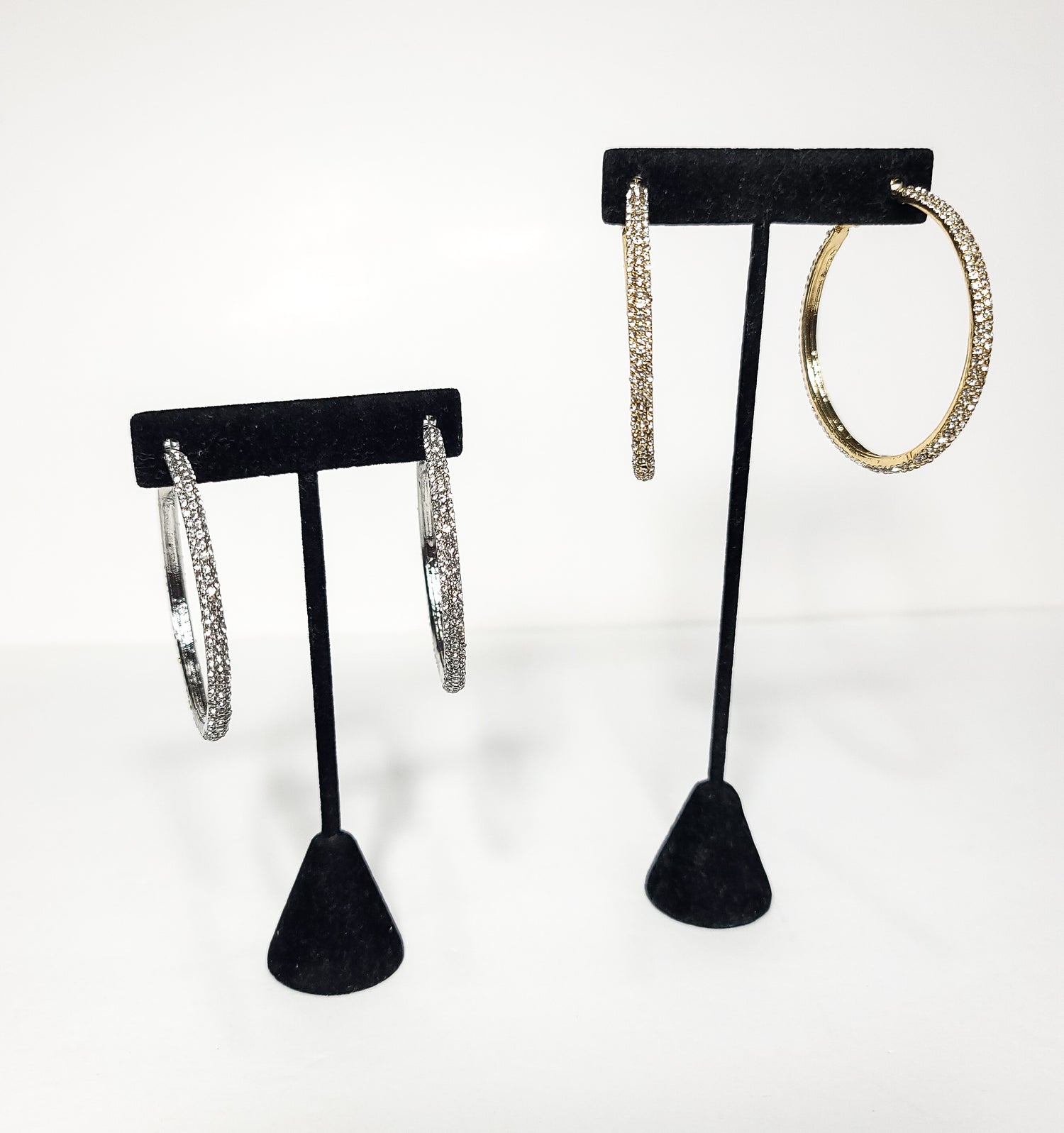 Medium to large size hoops encrusted with white glass rhinestones. Available in gold and sliver tone.