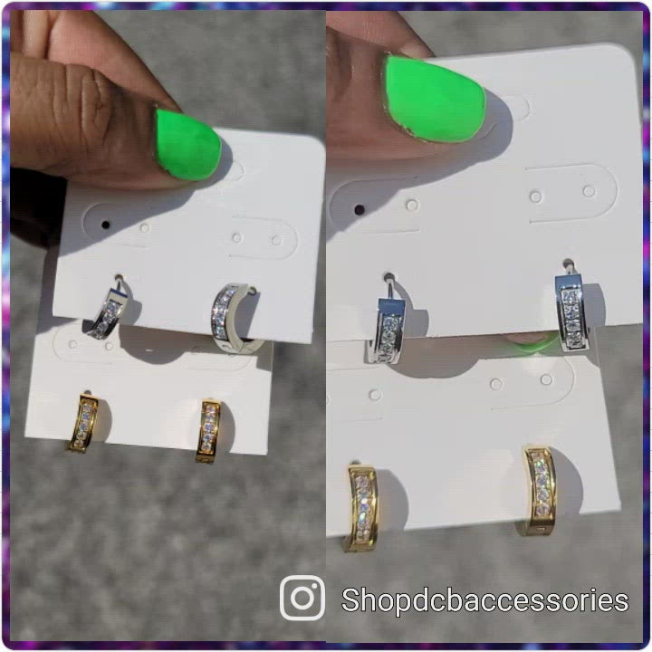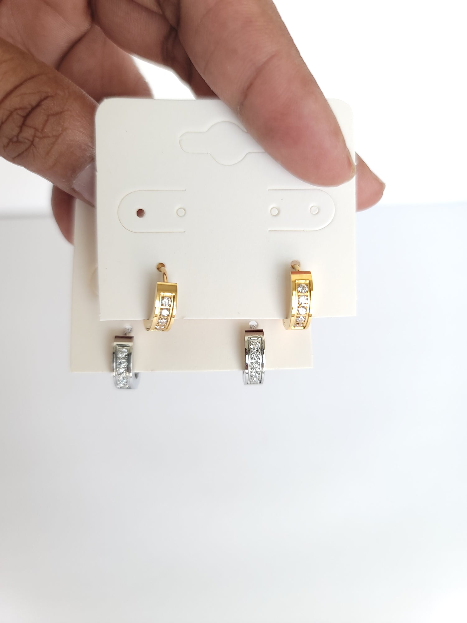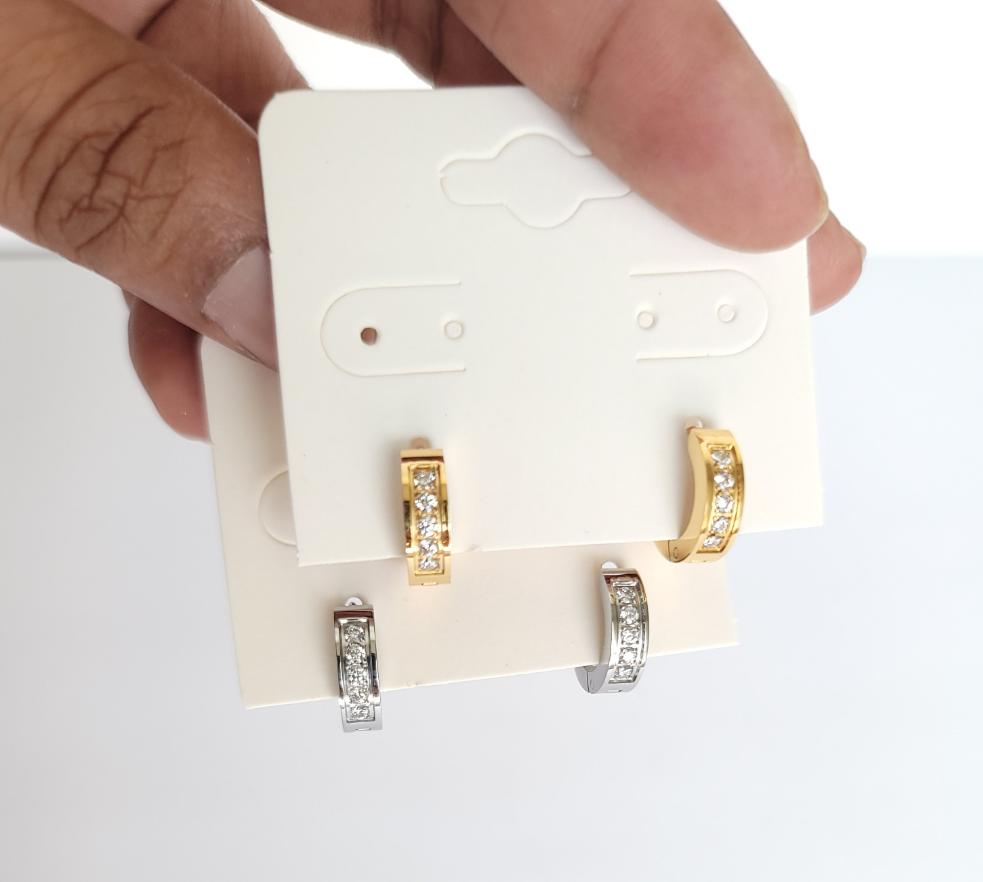 Small huggie style earrings encrusted with zircon crystals. Available in silver and gold.