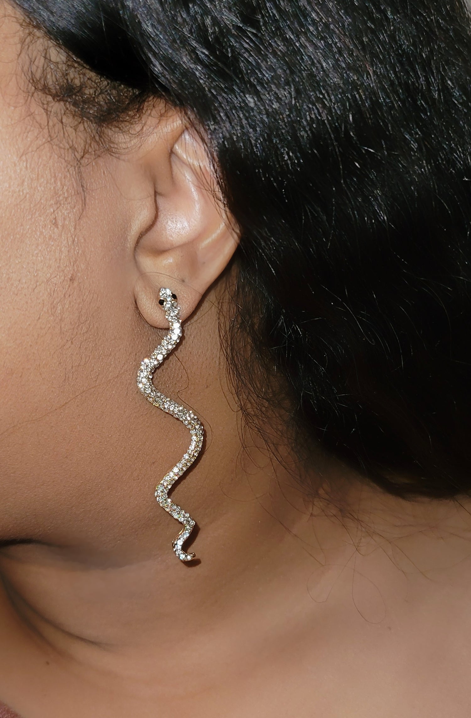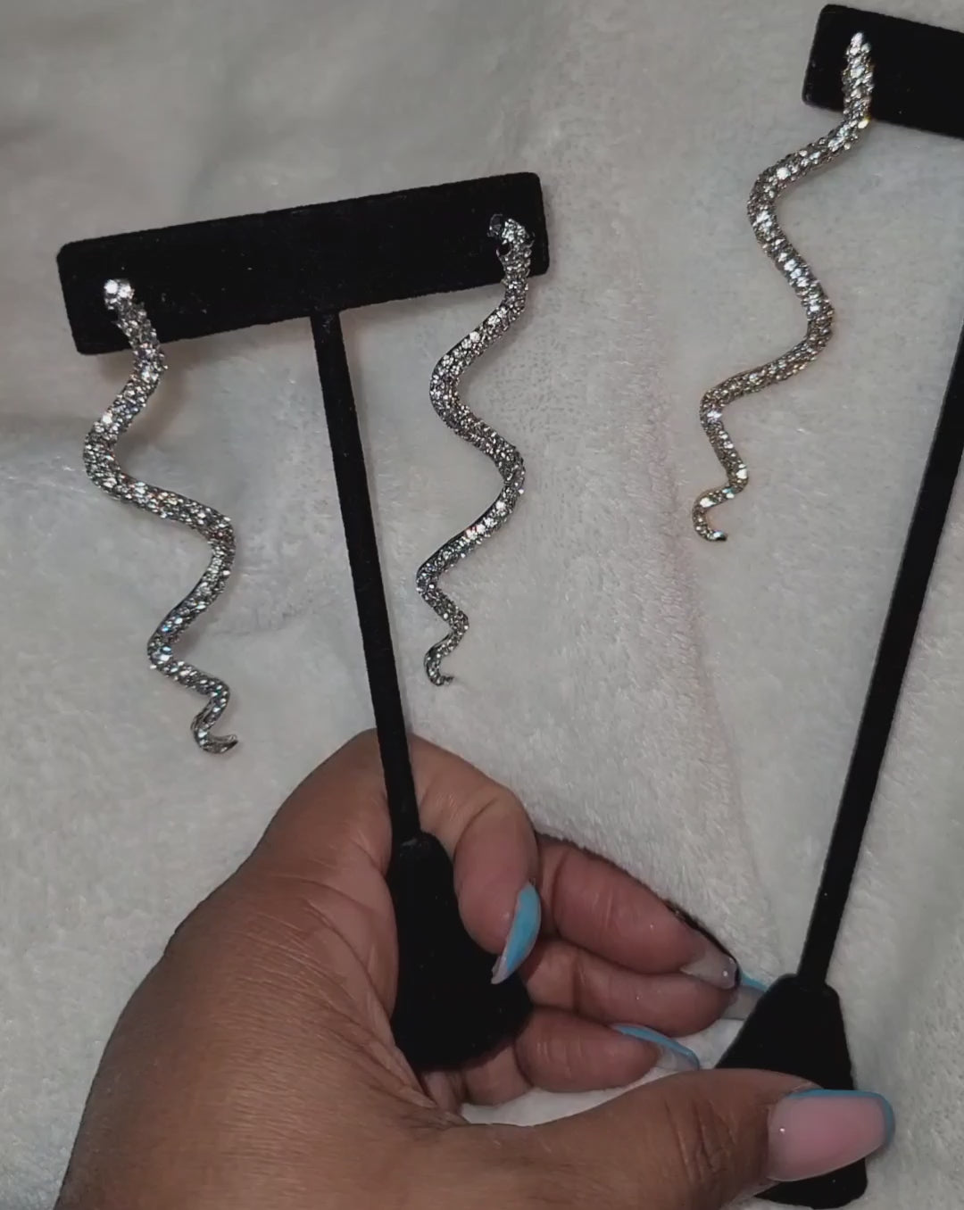 Available in gold and sliver tone encrusted with glass rhinestones. Earrings are about 3 inches long.