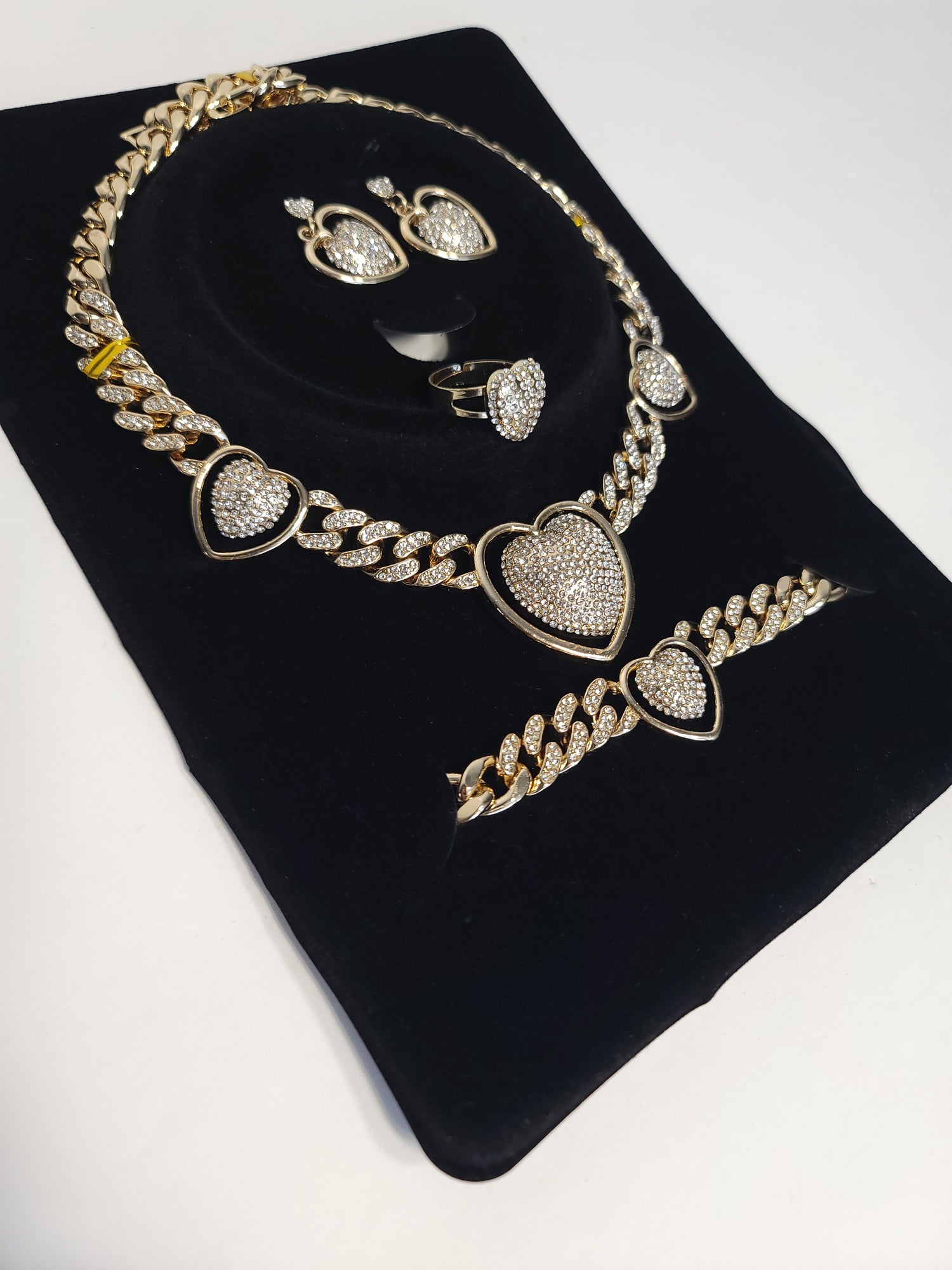 4 piece set includes necklace, earrings, bracelet and adjustable ring. 14k Italian gold plated hypoallergenic encrusted with cubic zirconia.