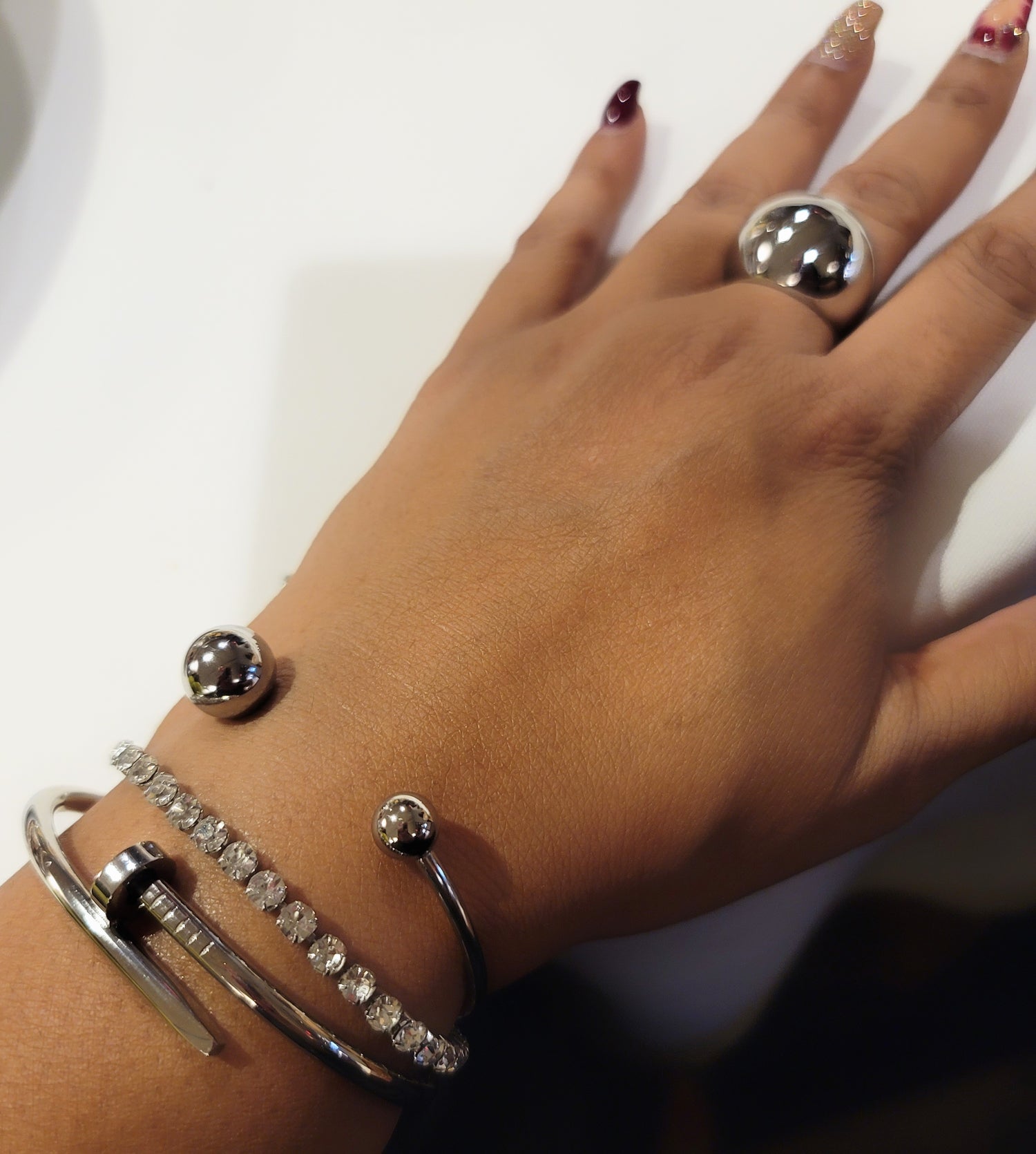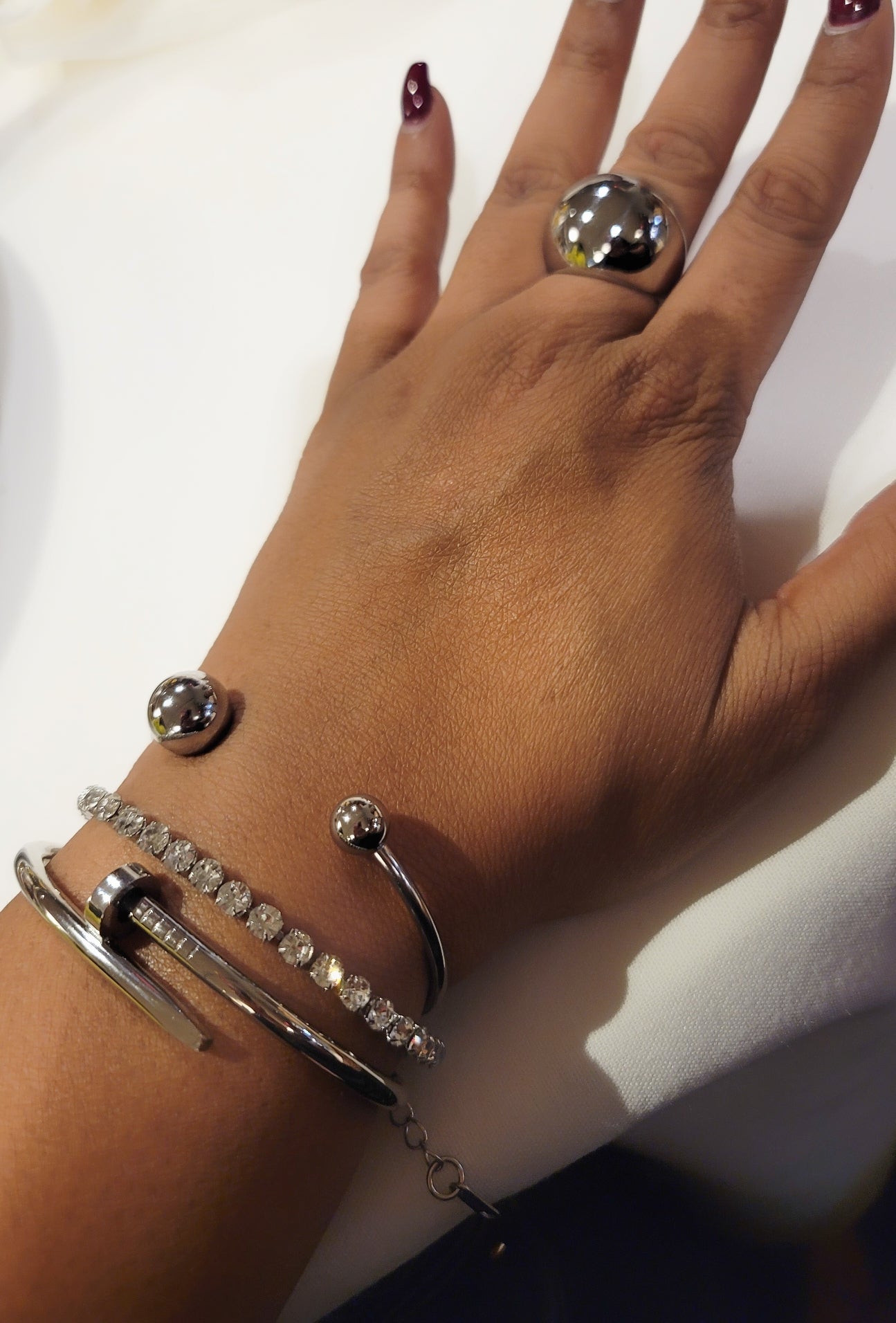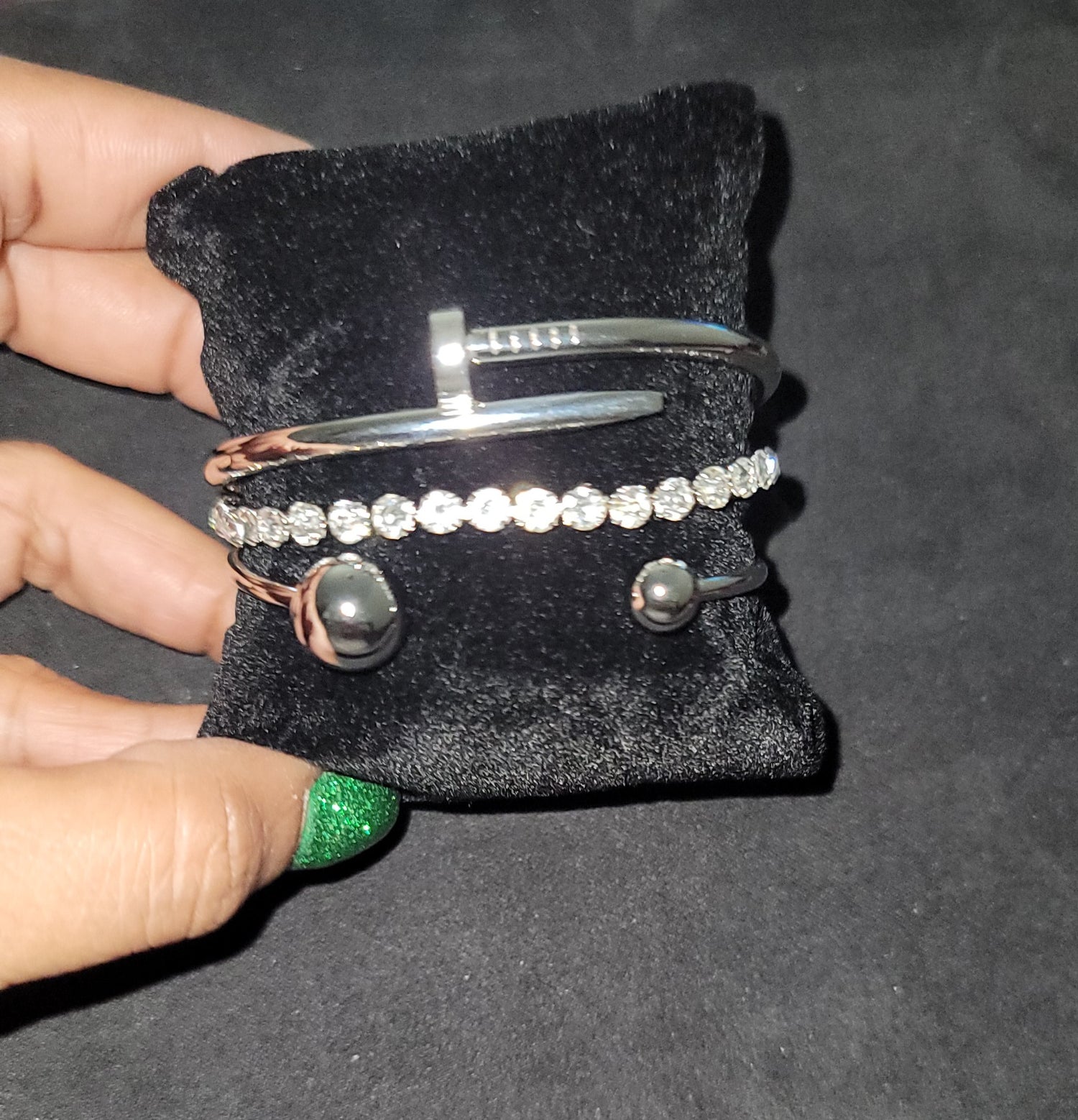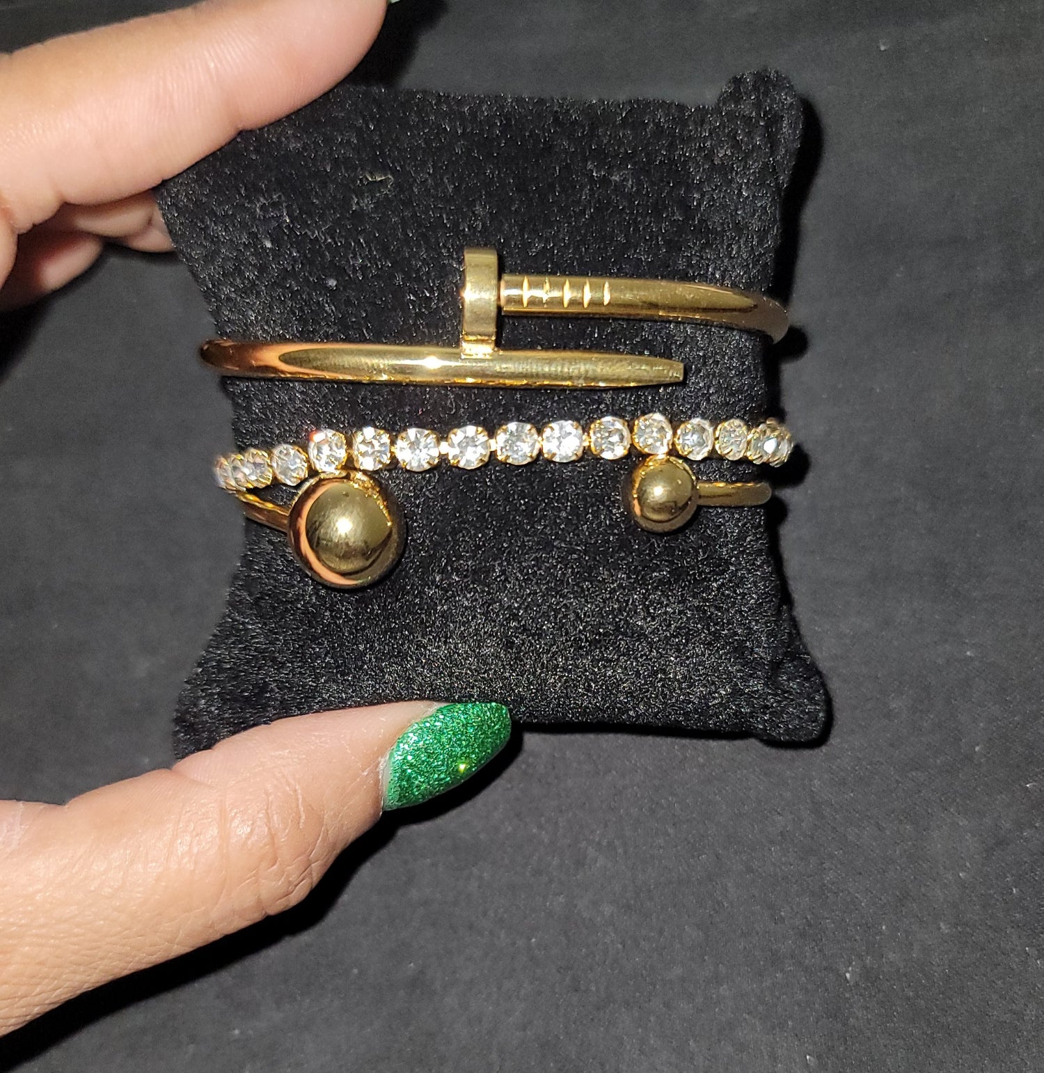 Made of fade-resistant high quality stainless steel available in gold and sliver. Sold in a set of 3 bracelets.